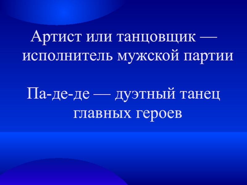 Артист или танцовщик — исполнитель мужской партииПа-де-де — дуэтный танец главных героев