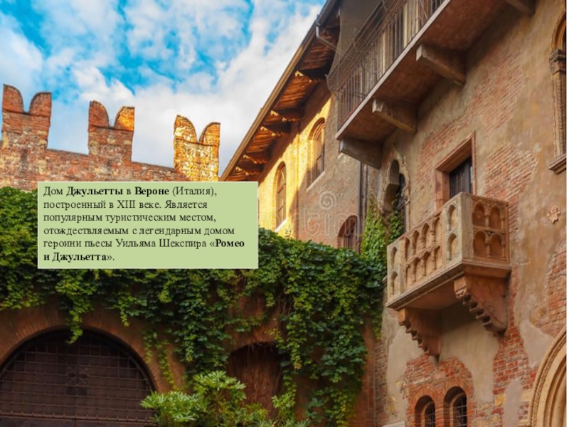 Слайд 10Дом Джульетты в Вероне (Италия), построенный в XIII веке. Является популярным туристическим местом, отождествляемым с
