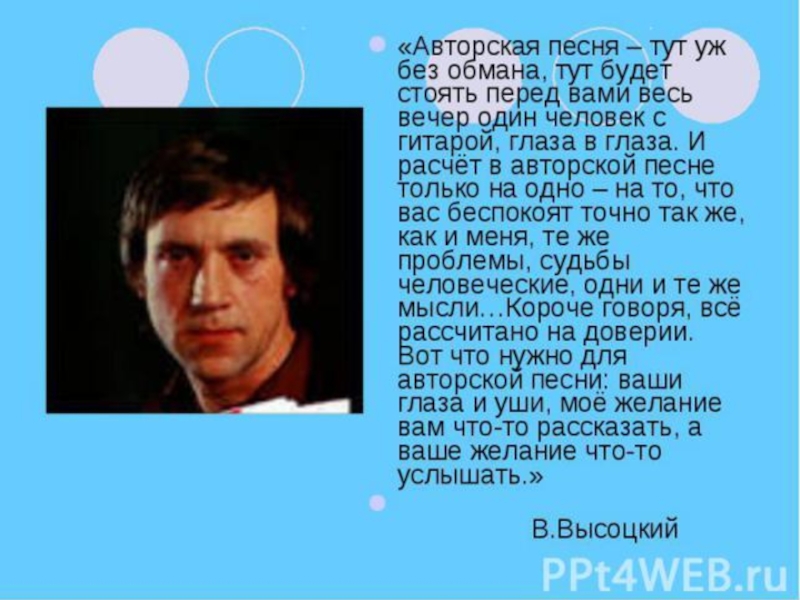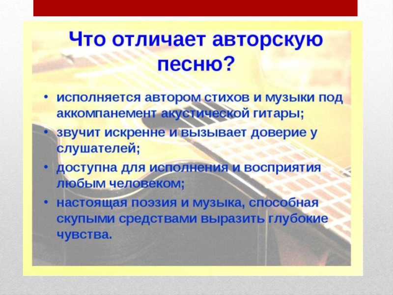 Слайд 5Авторская песня Авторские песни – это песни, создаваемые в основном непрофессиональными