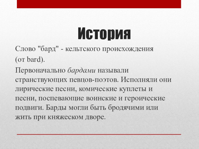 Исполняли они лирические песни, комические куплеты и песни, поспевающие воинские и героические подвиги. Барды могли быть бродячими или жить при княжеском дворе.