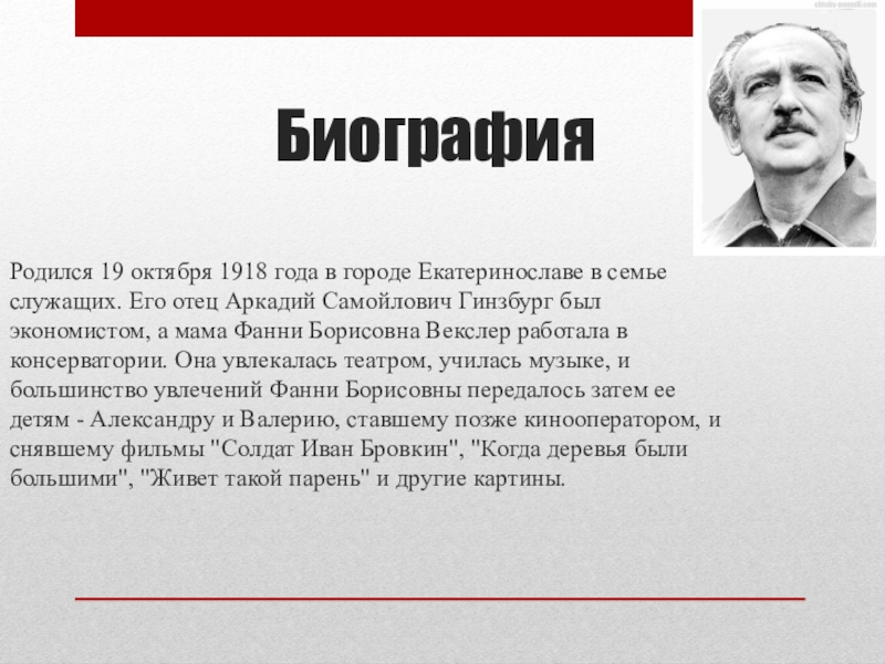 семье служащих. Его отец Аркадий Самойлович Гинзбург был экономистом, а мама Фанни Борисовна Векслер работала в консерватории. Она увлекалась театром, училась музыке, и большинство увлечений Фанни Борисовны передалось затем ее детям - Александру и Валерию, ставшему позже кинооператором, и снявшему фильмы "Солдат Иван Бровкин", "Когда деревья были большими", "Живет такой парень" и другие картины.