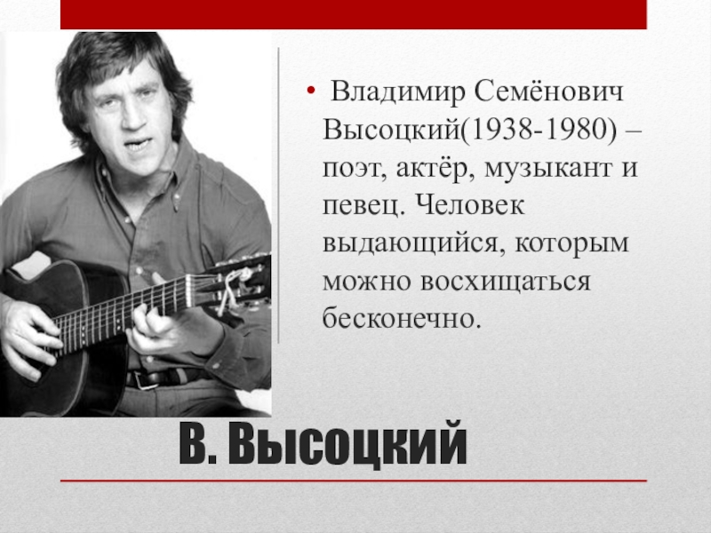 Владимир Семёнович Высоцкий(1938-1980) –поэт, актёр, музыкант и певец. Человек