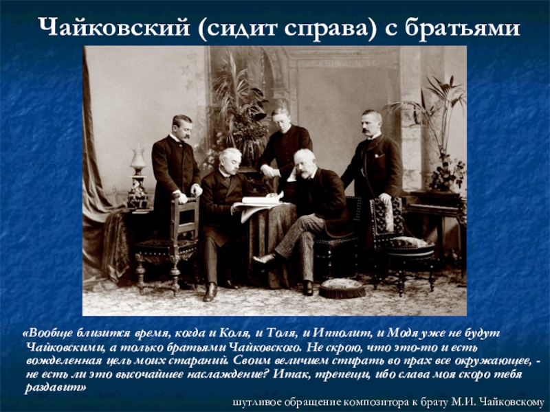 и Коля, и Толя, и Ипполит, и Модя уже не будут Чайковскими, а только братьями Чайковского. Не скрою, что это-то и есть вожделенная цель моих стараний. Своим величием стирать во прах все окружающее, - не есть ли это высочайшее наслаждение? Итак, трепещи, ибо слава моя скоро тебя раздавит»