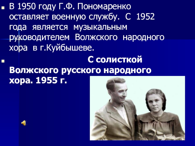 В 1950 году Г.Ф. Пономаренко оставляет военную службу. С 1952 года является музыкальным руководителем Волжского народного хора