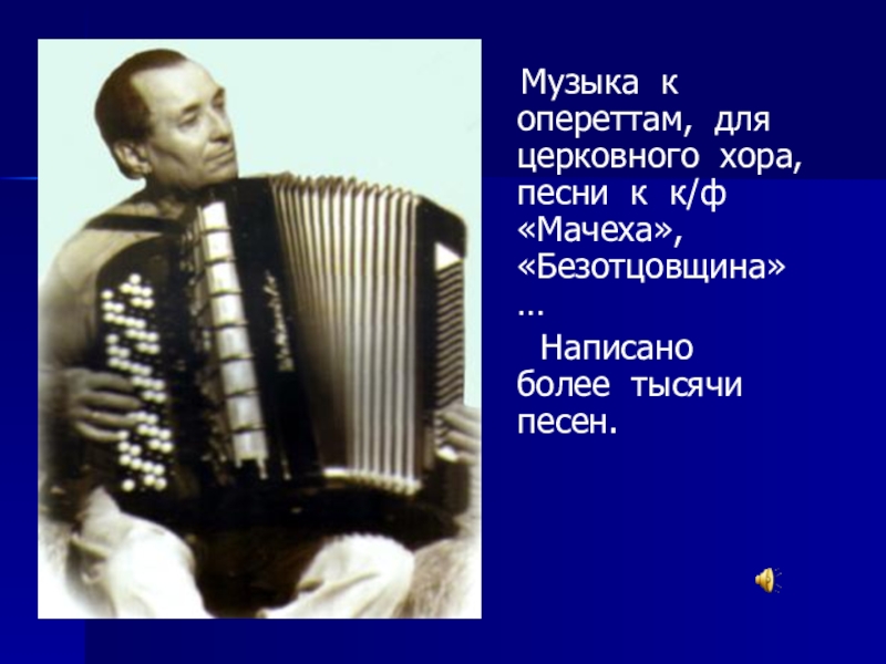 Музыка к   опереттам, для церковного хора, песни к к/ф «Мачеха», «Безотцовщина»…
