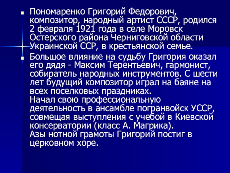 Слайд 2Пономаренко Григорий Федорович, композитор, народный артист СССР, родился 2 февраля 1921