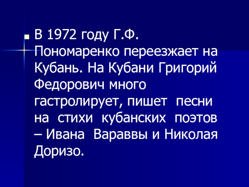 В 1972 году Г.Ф. Пономаренко переезжает на Кубань. На Кубани Григорий Федорович много гастролирует, пишет песни на
