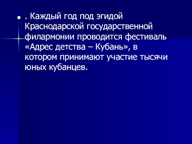 Слайд 23. Каждый год под эгидой Краснодарской государственной филармонии проводится фестиваль «Адрес