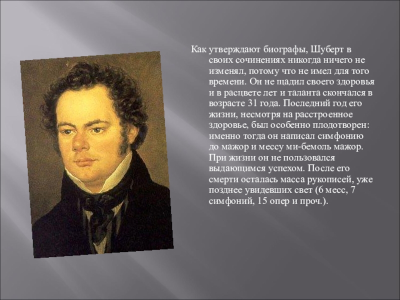 Слайд 6Как утверждают биографы, Шуберт в своих сочинениях никогда ничего не изменял,