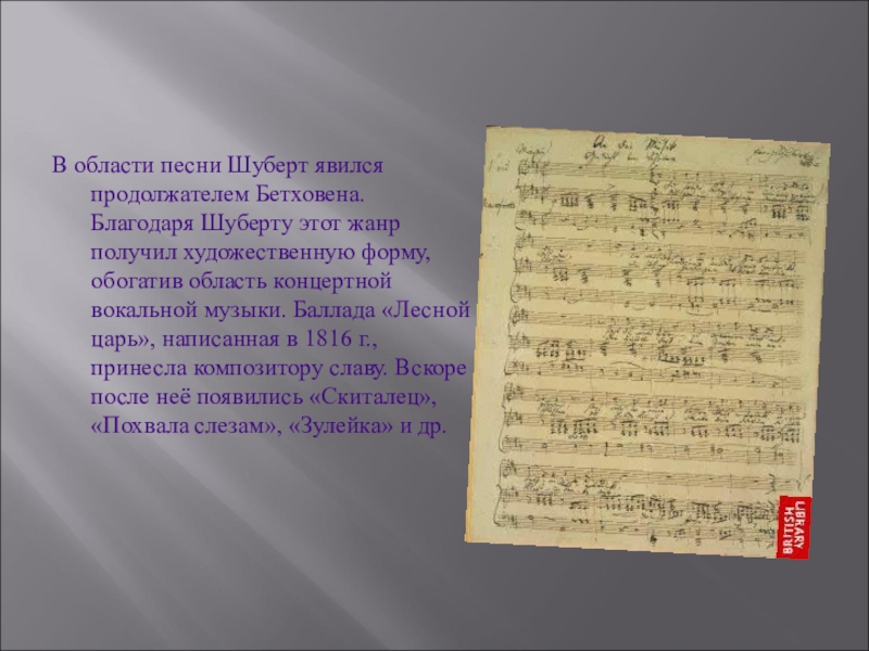 Слайд 5В области песни Шуберт явился продолжателем Бетховена. Благодаря Шуберту этот жанр