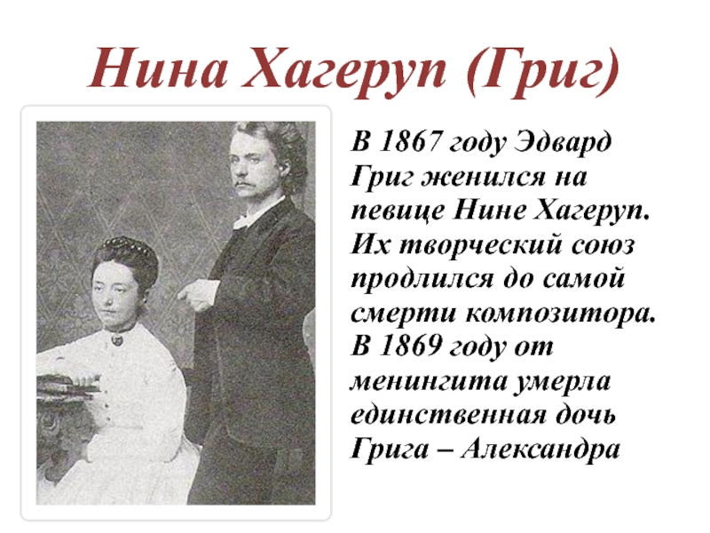 Хагеруп. Их творческий союз продлился до самой смерти композитора. В 1869 году от менингита умерла единственная дочь Грига – Александра