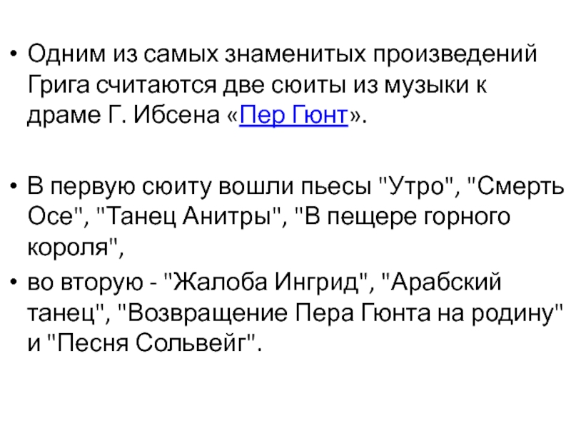 Одним из самых знаменитых произведений Грига считаются две сюиты из музыки к драме Г. Ибсена «Пер Гюнт».