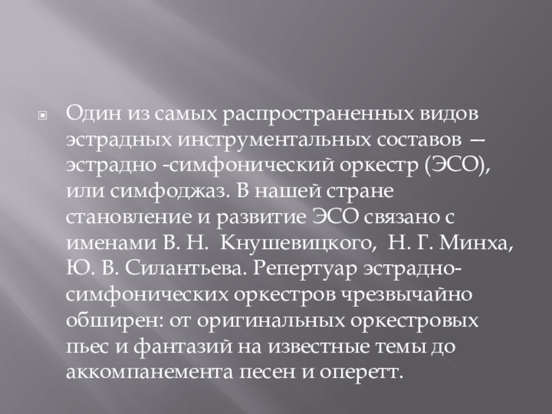 оркестр (ЭСО), или симфоджаз. В нашей стране становление и развитие ЭСО связано с именами В. Н. Кнушевицкого, Н. Г. Минха, Ю. В. Силантьева. Репертуар эстрадно- симфонических оркестров чрезвычайно обширен: от оригинальных оркестровых пьес и фантазий на известные темы до аккомпанемента песен и оперетт.