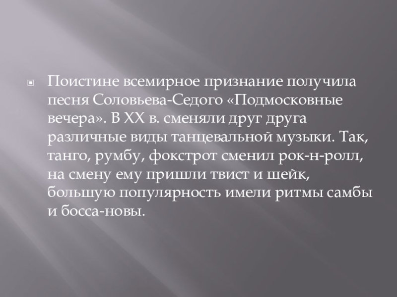 Поистине всемирное признание получила песня Соловьева-Седого «Подмосковные вечера». В XX в. сменяли друг друга различные виды танцевальной
