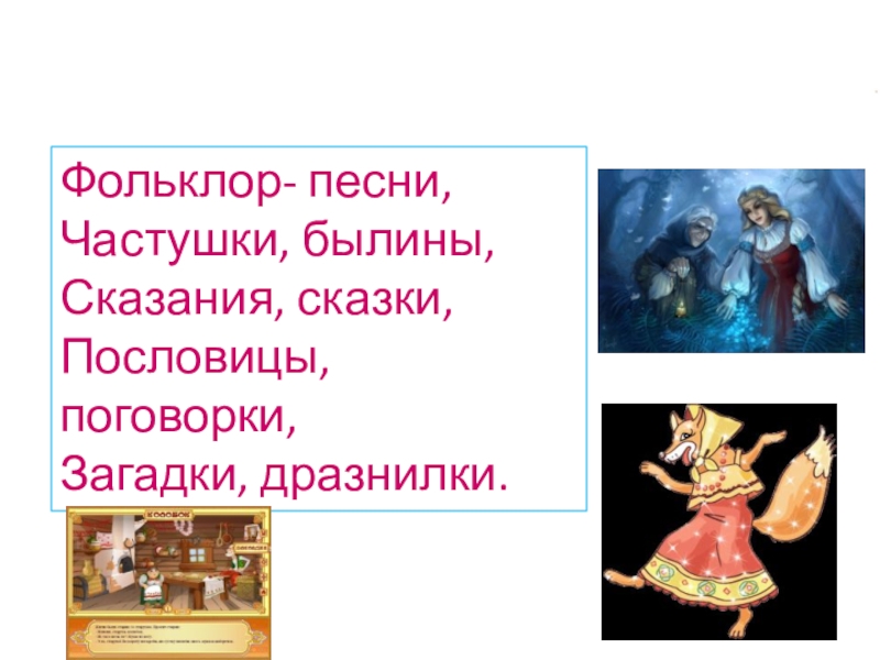 Фольклор- песни,Частушки, былины,Сказания, сказки,Пословицы, поговорки,Загадки, дразнилки.