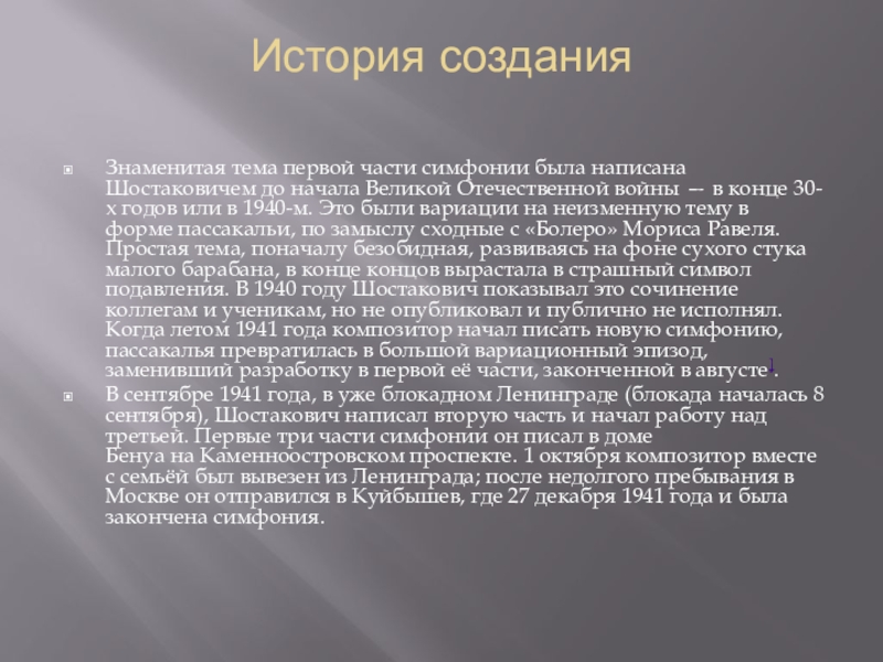 Отечественной войны — в конце 30-х годов или в 1940-м. Это были вариации на неизменную тему в форме пассакальи, по замыслу сходные с «Болеро» Мориса Равеля. Простая тема, поначалу безобидная, развиваясь на фоне сухого стука малого барабана, в конце концов вырастала в страшный символ подавления. В 1940 году Шостакович показывал это сочинение коллегам и ученикам, но не опубликовал и публично не исполнял. Когда летом 1941 года композитор начал писать новую симфонию, пассакалья превратилась в большой вариационный эпизод, заменивший разработку в первой её части, законченной в августе].