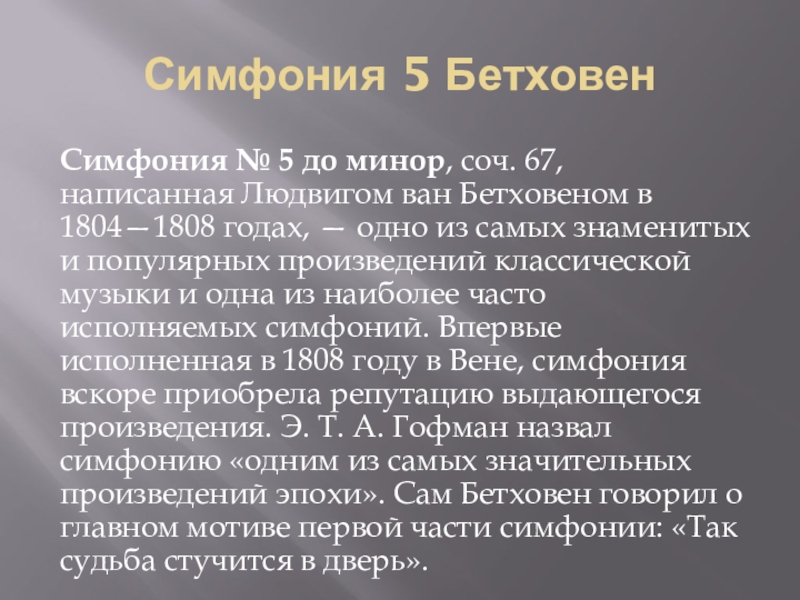 годах, — одно из самых знаменитых и популярных произведений классической музыки и одна из наиболее часто исполняемых симфоний. Впервые исполненная в 1808 году в Вене, симфония вскоре приобрела репутацию выдающегося произведения. Э. Т. А. Гофман назвал симфонию «одним из самых значительных произведений эпохи». Сам Бетховен говорил о главном мотиве первой части симфонии: «Так судьба стучится в дверь».