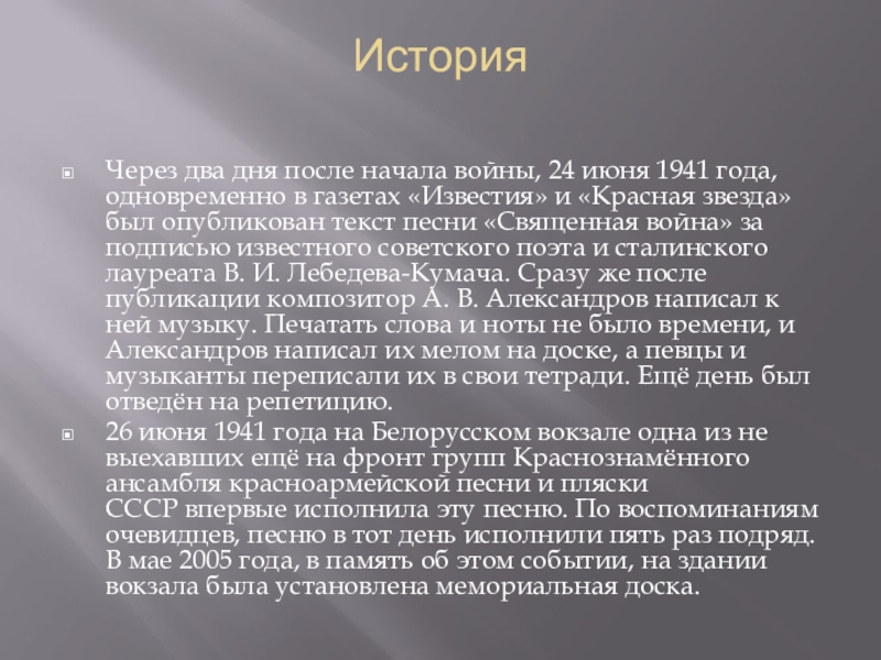 «Известия» и «Красная звезда» был опубликован текст песни «Священная война» за подписью известного советского поэта и сталинского лауреата В. И. Лебедева-Кумача. Сразу же после публикации композитор А. В. Александров написал к ней музыку. Печатать слова и ноты не было времени, и Александров написал их мелом на доске, а певцы и музыканты переписали их в свои тетради. Ещё день был отведён на репетицию.