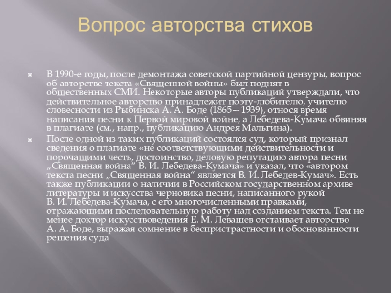 об авторстве текста «Священной войны» был поднят в общественных СМИ. Некоторые авторы публикаций утверждали, что действительное авторство принадлежит поэту-любителю, учителю словесности из Рыбинска А. А. Боде (1865—1939), относя время написания песни к Первой мировой войне, а Лебедева-Кумача обвиняя в плагиате (см., напр., публикацию Андрея Мальгина).