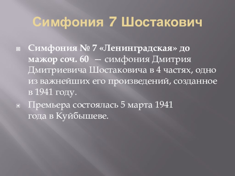 Шостаковича в 4 частях, одно из важнейших его произведений, созданное в 1941 году.