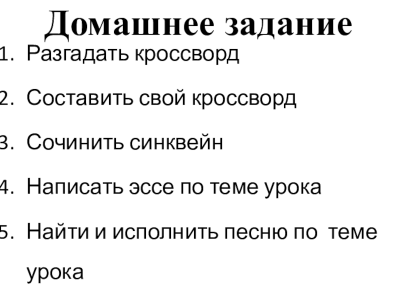 Домашнее заданиеРазгадать кроссвордСоставить свой кроссвордСочинить синквейнНаписать эссе по теме урокаНайти и исполнить песню по теме урока