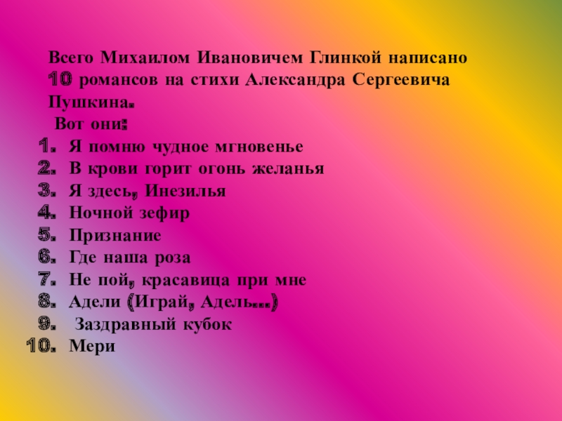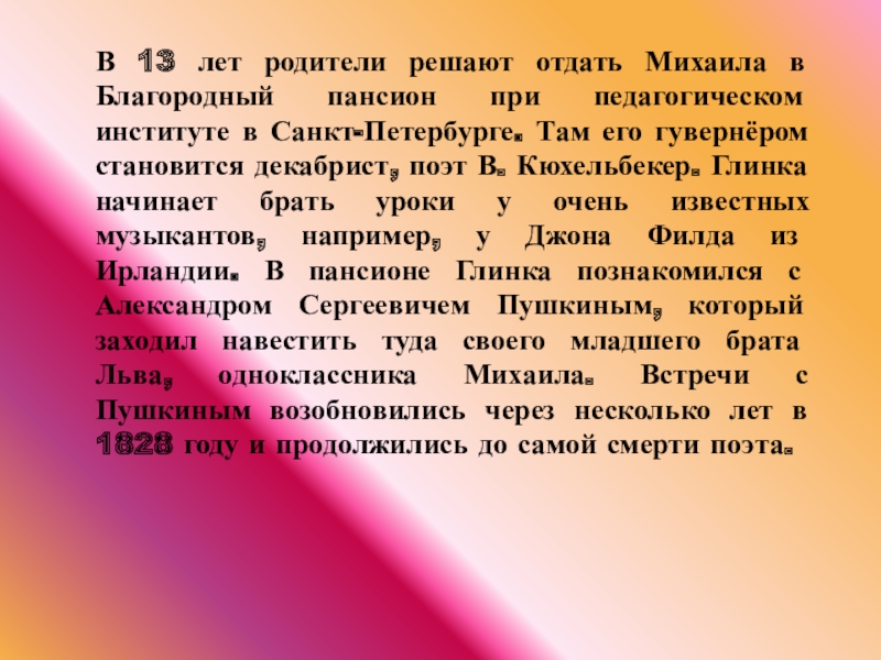 Биографы обнаружили интересный факт: связанные в жизни и творчестве, Александр Пушкин и Глинка родились с разницей в 5 лет и 5 дней, и ушли из жизни с разницей ровно в 5 дней и 20 лет.