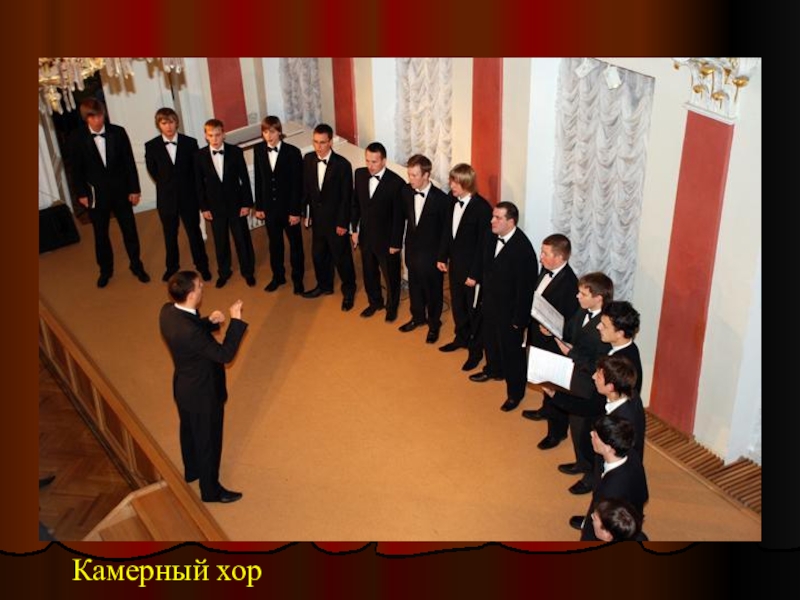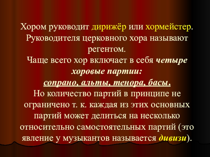 Слайд 5Хором руководит дирижёр или хормейстер. Руководителя церковного хора называют регентом. Чаще всего