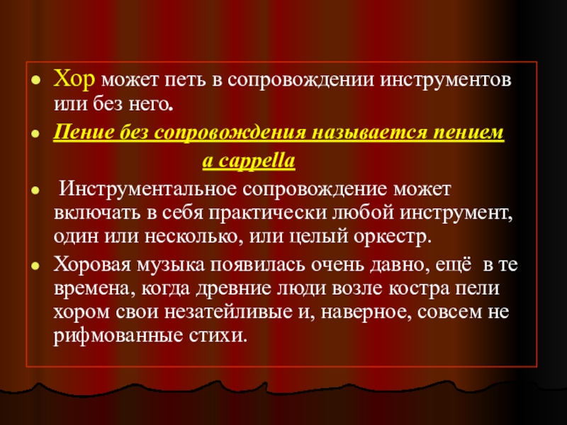 Хор может петь в сопровождении инструментов или без него. Пение без сопровождения называется пением