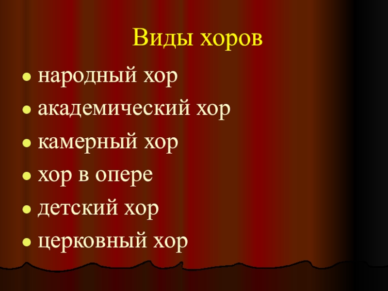 Виды хоровнародный хоракадемический хоркамерный хорхор в опередетский хорцерковный хор