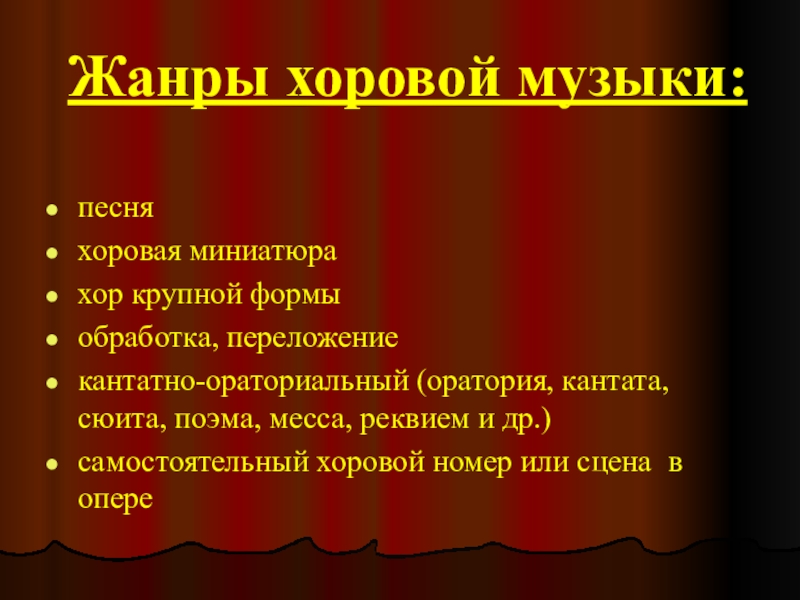 Жанры хоровой музыки:песняхоровая миниатюрахор крупной формыобработка, переложениекантатно-ораториальный (оратория, кантата, сюита, поэма, месса, реквием и др.)самостоятельный хоровой номер
