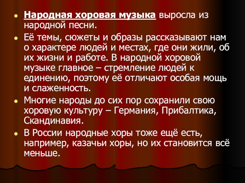 рассказывают нам о характере людей и местах, где они жили, об их жизни и работе. В народной хоровой музыке главное – стремление людей к единению, поэтому её отличают особая мощь и слаженность.