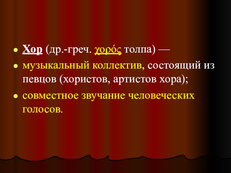 Хор (др.-греч. χορός толпа) — музыкальный коллектив, состоящий из певцов (хористов, артистов хора); совместное звучание человеческих голосов.