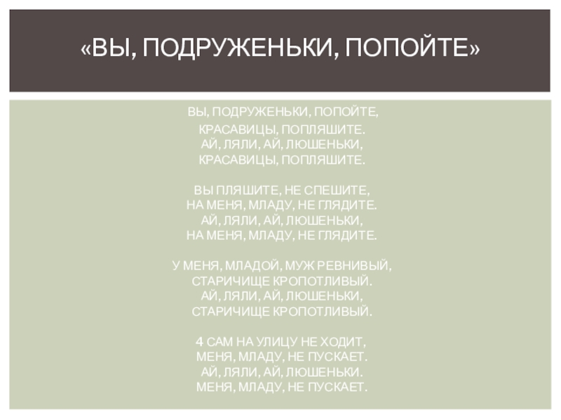 эта песня носит сюжетный характер, в ней молодая жена просит своего мужа и свекра пустить ее погулять с подругами, вспомнить дни, когда она была незамужней девушкой. В песне 3 действующих лица. Ролями можно меняться, повторяя хоровод много раз.