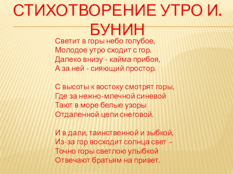 СТИХОТВОРЕНИЕ УТРО И.БУНИНСветит в горы небо голубое,Молодое утро сходит с гор.Далеко внизу - кайма прибоя,А за ней