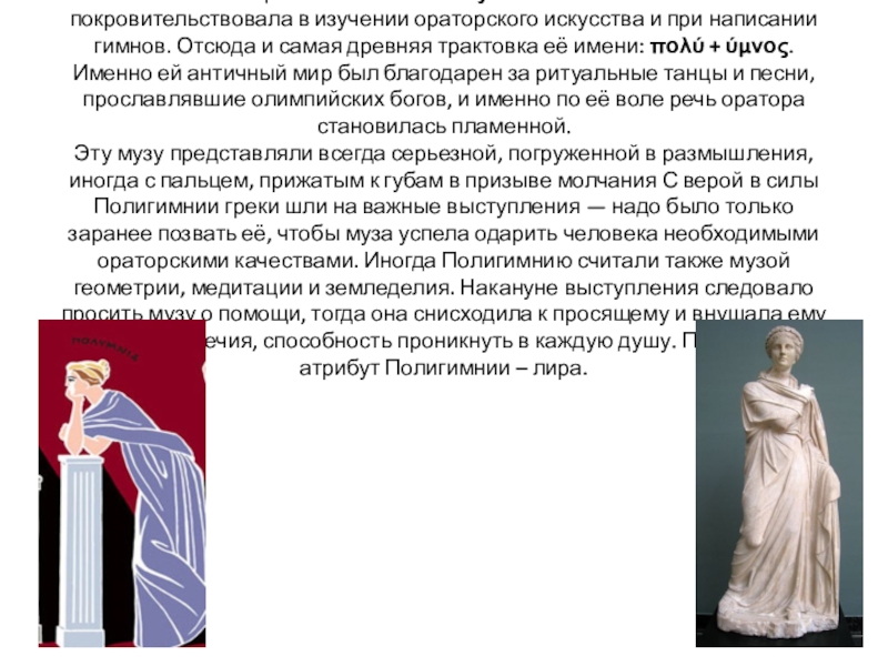 изучении ораторского искусства и при написании гимнов. Отсюда и самая древняя трактовка её имени: πολύ + ύμνος. Именно ей античный мир был благодарен за ритуальные танцы и песни, прославлявшие олимпийских богов, и именно по её воле речь оратора становилась пламенной.