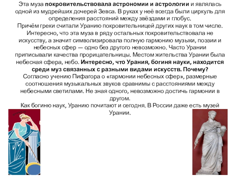 Слайд 12Ещё одна, девятая, муза — Урания-самая младшая из дочерей Зевса. Эта муза