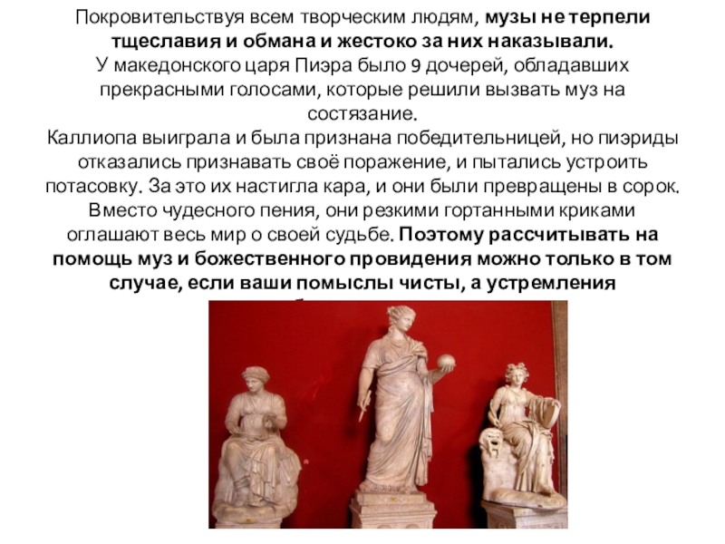 Слайд 14Покровительствуя всем творческим людям, музы не терпели тщеславия и обмана и