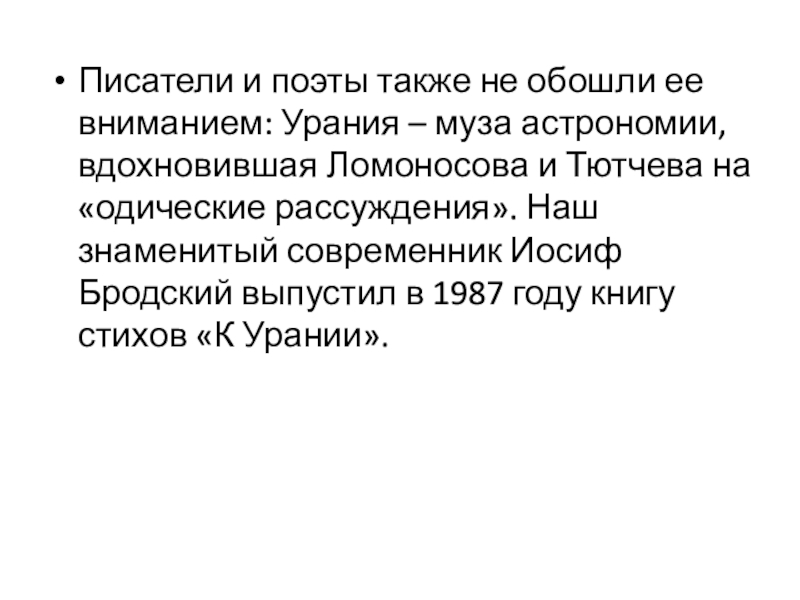 астрономии, вдохновившая Ломоносова и Тютчева на «одические рассуждения». Наш знаменитый современник Иосиф Бродский выпустил в 1987 году книгу стихов «К Урании».