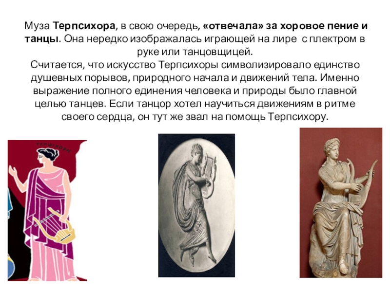 Слайд 10Муза Терпсихора, в свою очередь, «отвечала» за хоровое пение и танцы. Она