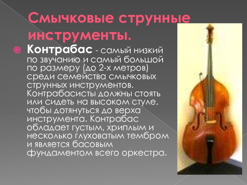 по размеру (до 2-х метров) среди семейства смычковых струнных инструментов. Контрабасисты должны стоять или сидеть на высоком стуле, чтобы дотянуться до верха инструмента. Контрабас обладает густым, хриплым и несколько глуховатым тембром и является басовым фундаментом всего оркестра.