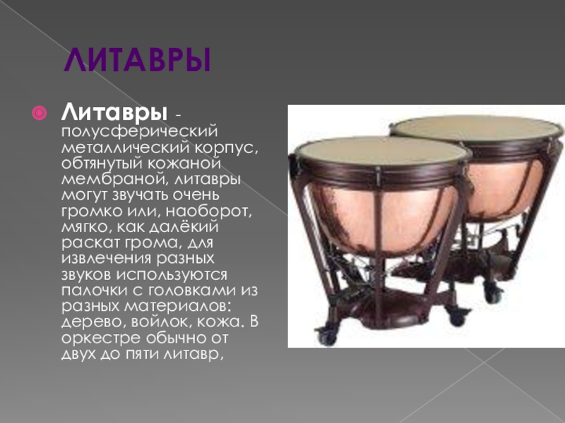 Литавры - полусферический металлический корпус, обтянутый кожаной мембраной, литавры могут звучать