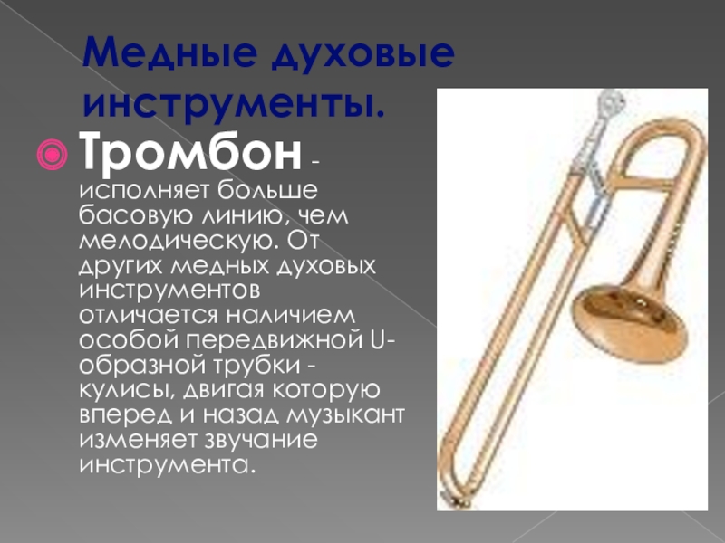других медных духовых инструментов отличается наличием особой передвижной U-образной трубки - кулисы, двигая которую вперед и назад музыкант изменяет звучание инструмента.