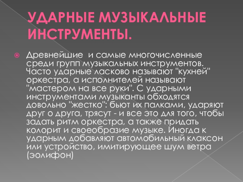 ударные ласково называют "кухней" оркестра, а исполнителей называют "мастером на все руки". С ударными инструментами музыканты обходятся довольно "жестко": бьют их палками, ударяют друг о друга, трясут - и все это для того, чтобы задать ритм оркестра, а также придать колорит и своеобразие музыке. Иногда к ударным добавляют автомобильный клаксон или устройство, имитирующее шум ветра (эолифон)