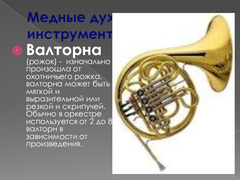 Валторна (рожок) - изначально произошла от охотничьего рожка, валторна