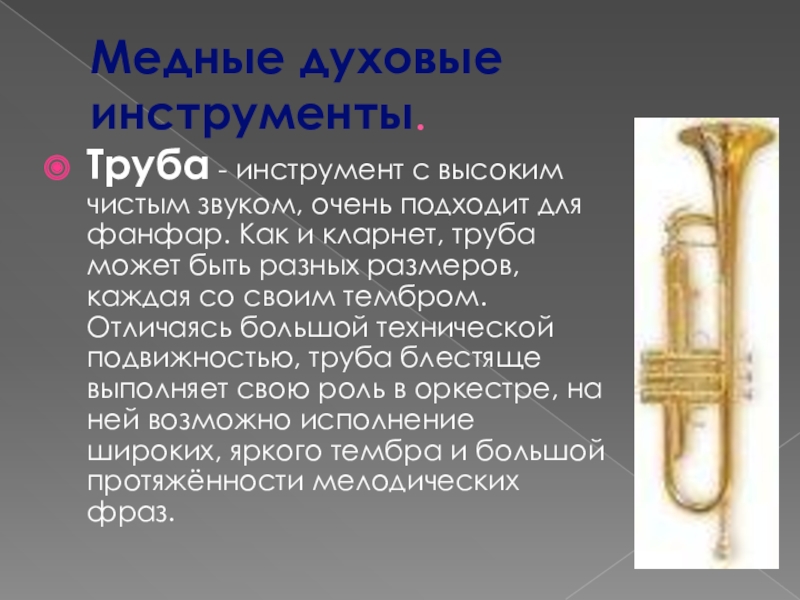 для фанфар. Как и кларнет, труба может быть разных размеров, каждая со своим тембром. Отличаясь большой технической подвижностью, труба блестяще выполняет свою роль в оркестре, на ней возможно исполнение широких, яркого тембра и большой протяжённости мелодических фраз.