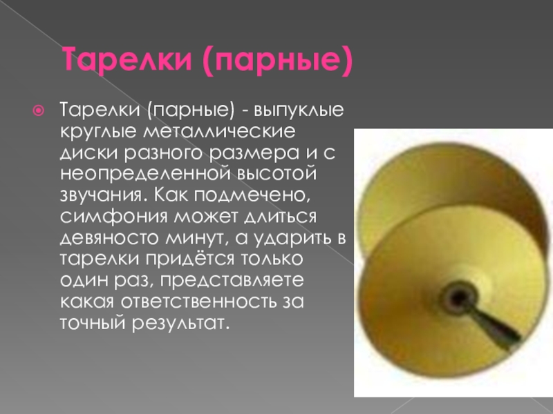 с неопределенной высотой звучания. Как подмечено, симфония может длиться девяносто минут, а ударить в тарелки придётся только один раз, представляете какая ответственность за точный результат.