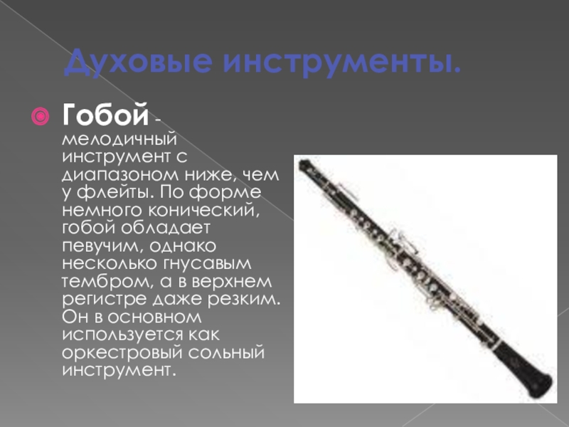 По форме немного конический, гобой обладает певучим, однако несколько гнусавым тембром, а в верхнем регистре даже резким. Он в основном используется как оркестровый сольный инструмент.