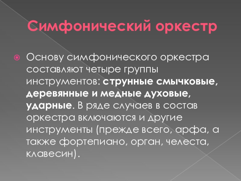 и медные духовые, ударные. В ряде случаев в состав оркестра включаются и другие инструменты (прежде всего, арфа, а также фортепиано, орган, челеста, клавесин).