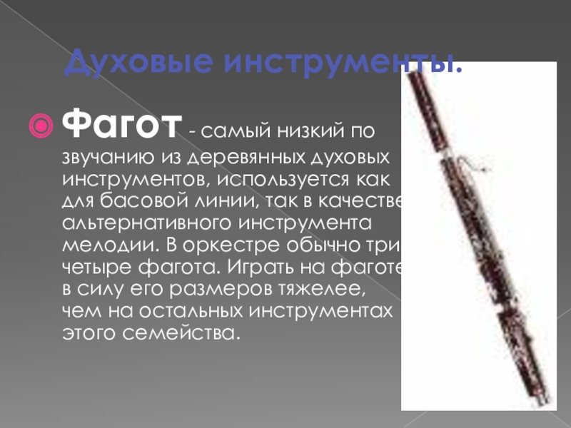Фагот - самый низкий по звучанию из деревянных духовых инструментов,