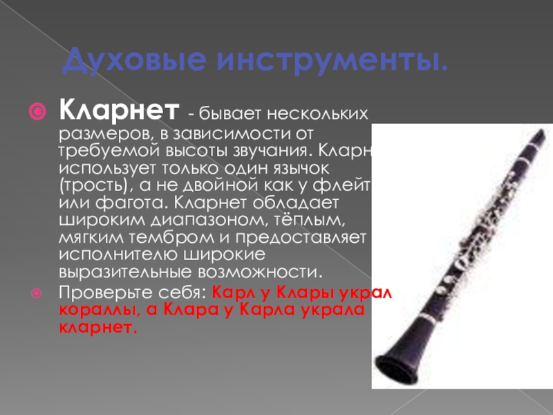 звучания. Кларнет использует только один язычок (трость), а не двойной как у флейты или фагота. Кларнет обладает широким диапазоном, тёплым, мягким тембром и предоставляет исполнителю широкие выразительные возможности.